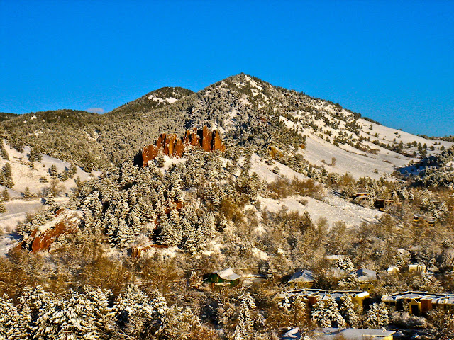 Up and down 1st Saddle with the snowshoes again. Was unavoidably delayed in hitting the road for Nebraska, so went for another trip up the mountain. Remarkably warm afternoon made for some very good packing conditions on much of the trail and I got the stowing/strapping/pack strategy dialed for the snowshoes and the poles so that riding a bike isn't an issue at all. Felt way more confident and nimble with the s-shoes and poles today when compared to yesterday.