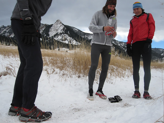 Yesterday's warm temps shrunk some of the ice/snow on the trails, almost to where spikes are becoming too much--except for the steep upper reaches of Bear Peak. Microspikes are still great up there. The warm weather continued this morning--Front Range winters are ideal.