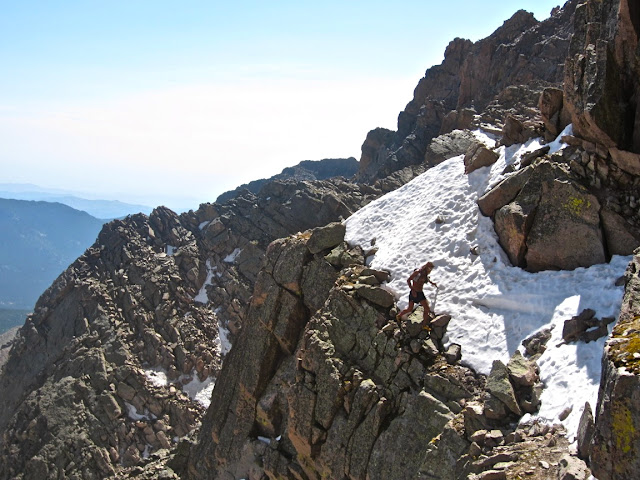 Since I'm not yet comfortable downclimbing the wet North Face, though, after literally 5 seconds of catching my breath I descended the Keyhole route, passing a bunch of people on the Narrows and moving quite well down a completely dry Trough. After the Boulder Field outhouse I cut across for the ridge and took my now usual descent down to Jim Grove and back to the TH, running pretty much as hard as I could because I needed to get back to Boulder for an appointment.